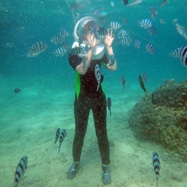 Walk on the surface of the ocean with marine life and beautiful coral reefs.
